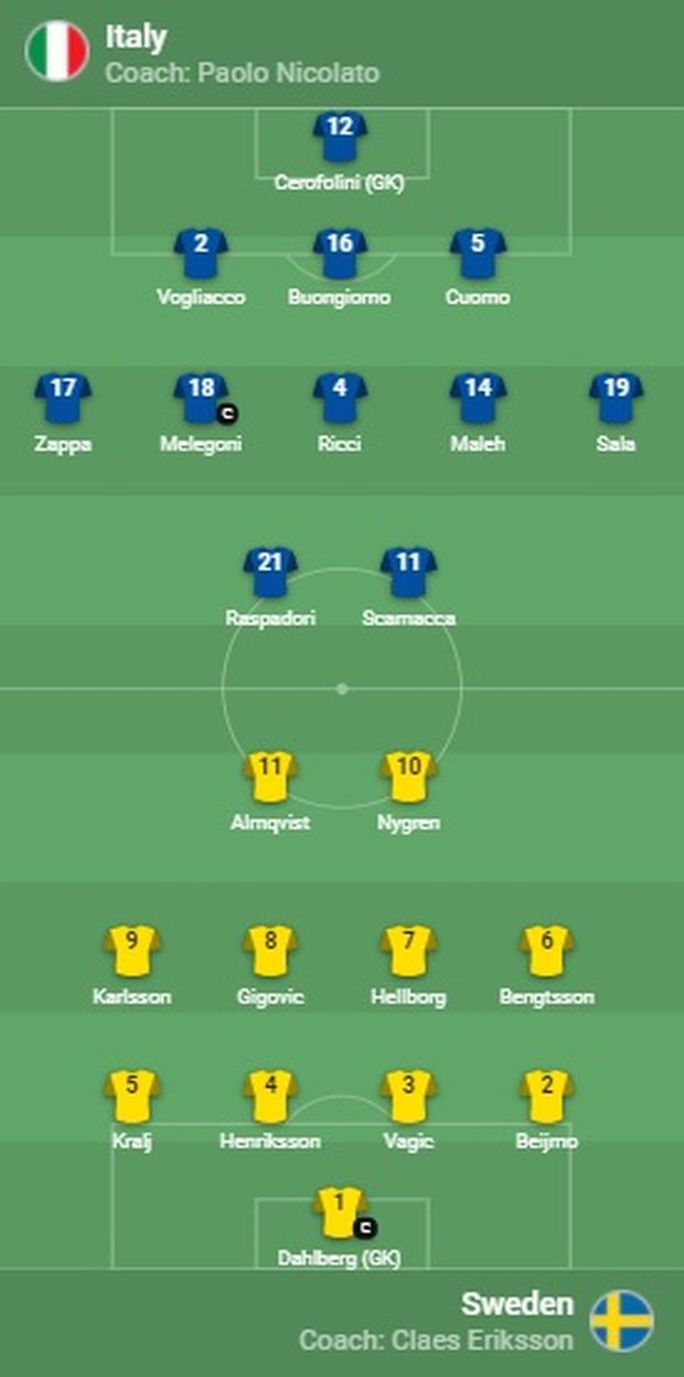1 - La Svezia, nella tradizionale divisa gialla con pantaloncini azzurri, ha mosso il primo pallone della gara. Italia in campo con la classica maglia azzurra con pantaloncini bianchi. Formazione completamente rivoluzionata per l'Italia, con i soli Sala e Scamacca "reduci" dall'undici titolare che ha sconfitto il Lussemburgo
