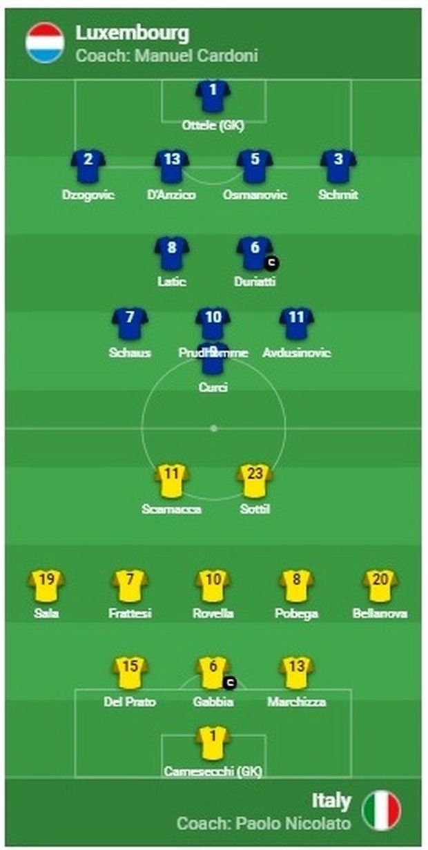 1 - Il Lussemburgo, in completa divisa rossa, muove la prima palla della gara. Italia con la tradizionale maglia azzurra, con pantaloncini bianchi