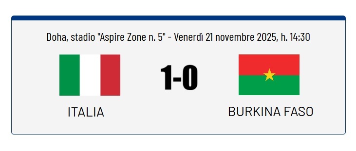 | ITALIA (4-3-1-2) - Longoni; Iddrisa, Reggiani (C), Borasio, Mambuku; Luongo [90 Pandolfi], Prisco, Steffanoni [69 Marini]; Inacio [90 Bovio]; Arena [69 Campaniello], Lontani [55 Elimoghale] All.: Massimiliano FAVO |