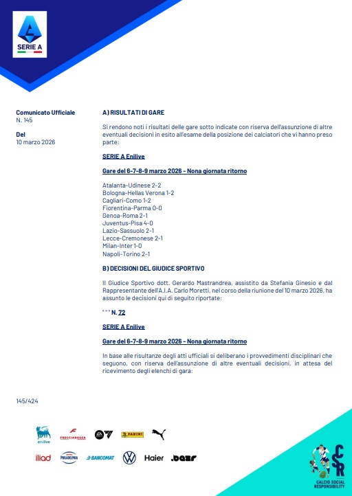 Il comunicato ufficiale completo del Giudice Sportivo dopo le gare dell'ultima giornata del campionato di Serie A 2025-26