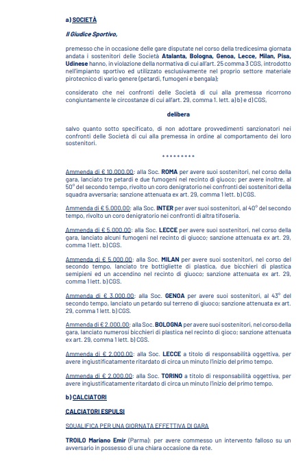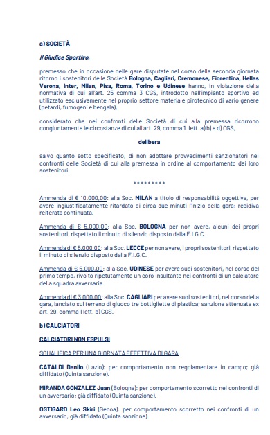 IL COMUNICATO DEL GIUDICE SPORTIVO