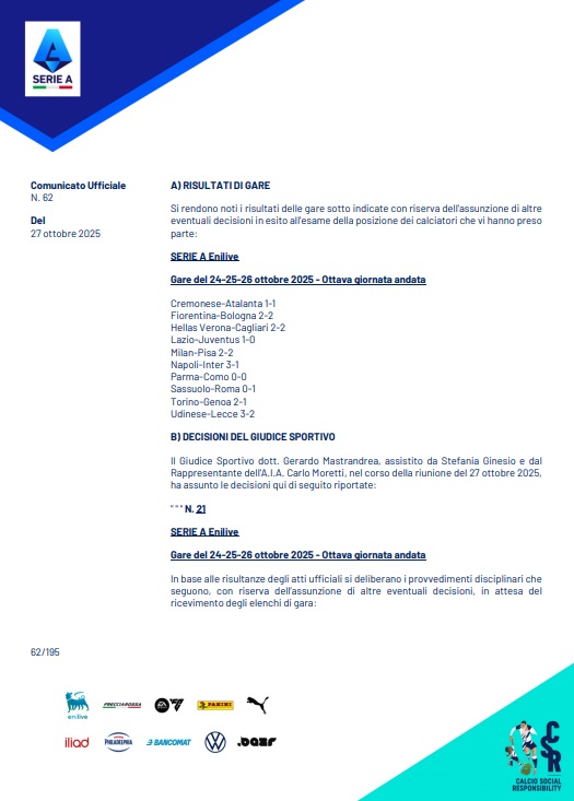 Il comunicato ufficiale completo del Giudice Sportivo dopo le gare dell'ultima giornata del campionato di Serie A 2025-26