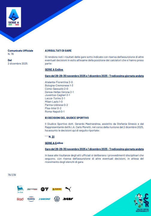 Il comunicato ufficiale completo del Giudice Sportivo dopo le gare dell'ultima giornata del campionato di Serie A 2025-26