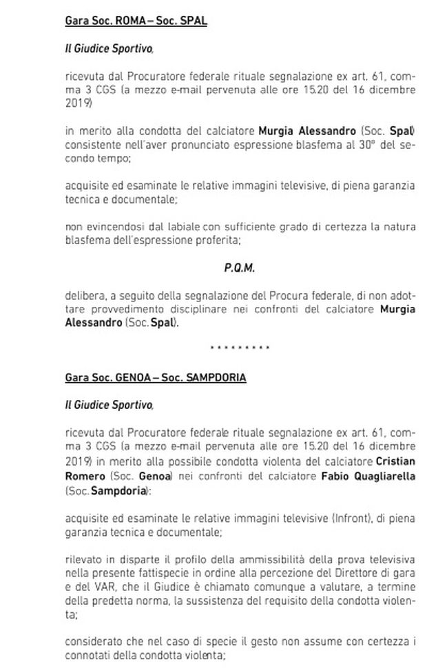 Serie A – Giudice Sportivo: 11 squalificati. Scagionati Murgia e Romero. Gli sputi all’arbitro costano carissimi al Cagliari
