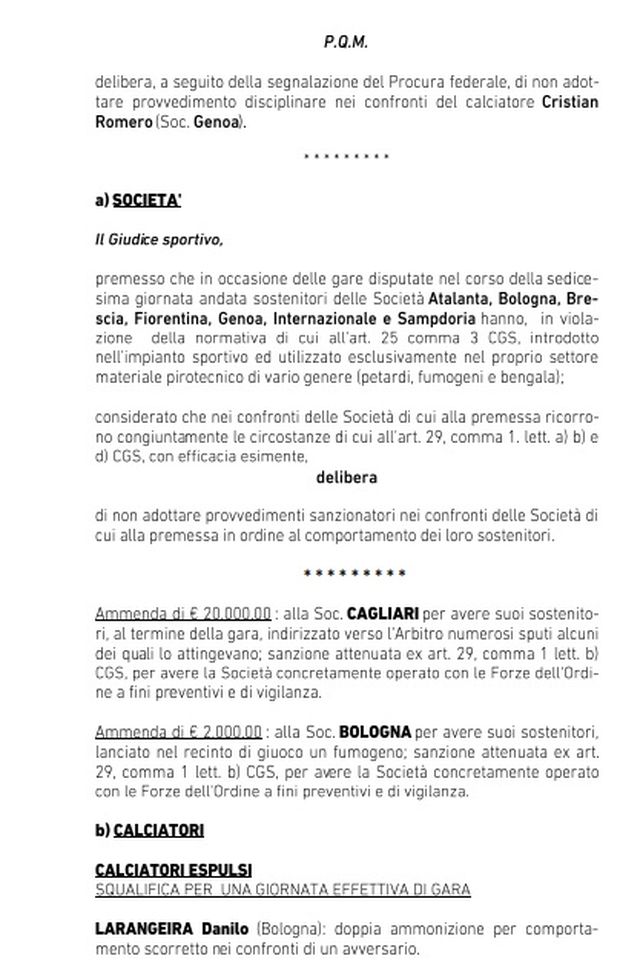 Serie A – Giudice Sportivo: 11 squalificati. Scagionati Murgia e Romero. Gli sputi all’arbitro costano carissimi al Cagliari