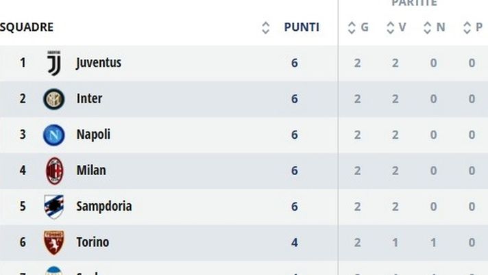 Dopo le prime 2 giornate di campionato sono 5 le squadre in testa alla classifica a punteggio pieno (Inter, Juventus, Milan, Napoli e Sampdoria).