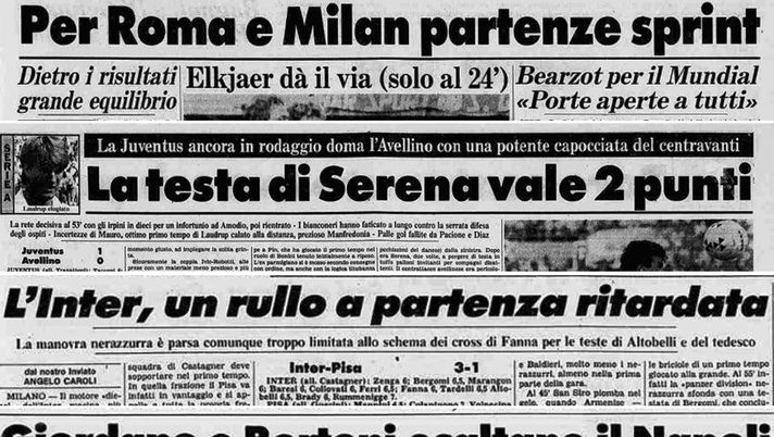 Andando a ritroso c'è sempre almeno una big che inciampa in un ostacolo (spesso morbido, anche se solo sulla carta) e bisogna incredibilmente tornare alla stagione 1985-1986 per ritrovare le cinque "grandi" tutte vittoriose al primo turno di campionato. Anche 32 anni fa (era l'8 settembre '85) la Roma vinse fuori con l'Atalanta (2-1, a segno Pruzzo e Nela). L'Inter segnò tre gol a San Siro (ma al Pisa, 3-1 il finale con super Rummenigge sugli scudi) e il Milan battè fuori casa una squadra del sud (il Bari 1-0, con gol di Icardi, non Maurito...). A completare il quadro, i successi della Juve, 1-0 in casa sull'Avellino (la decise Aldo Serena), e del Napoli, al San Paolo col Como (2-1 con le reti di Giordano e Bertoni). Altra analogia, l'ennesima, anche quel campionato conduceva a un Mondiale, quello di Messico '86. E chi lo vinse? La Juve...