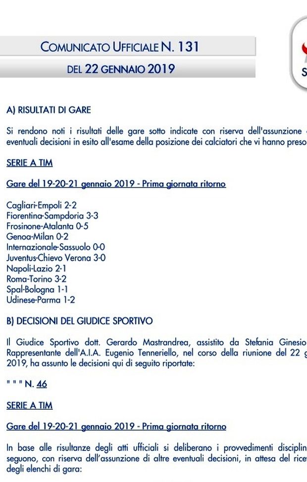 Il comunicato ufficiale del Giudice Sportivo dopo la 20° giornata di Serie A