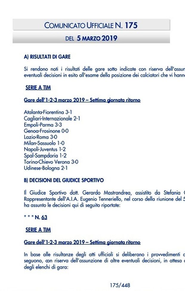 Il comunicato ufficiale del Giudice Sportivo dopo la 26° giornata di Serie A