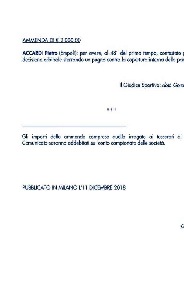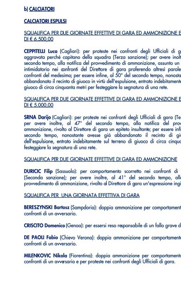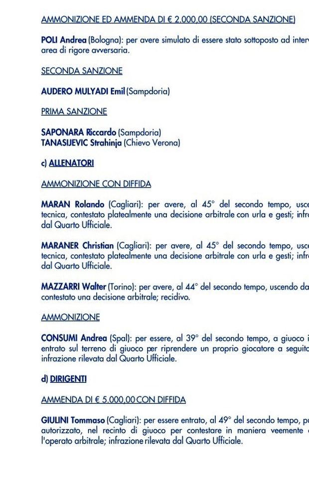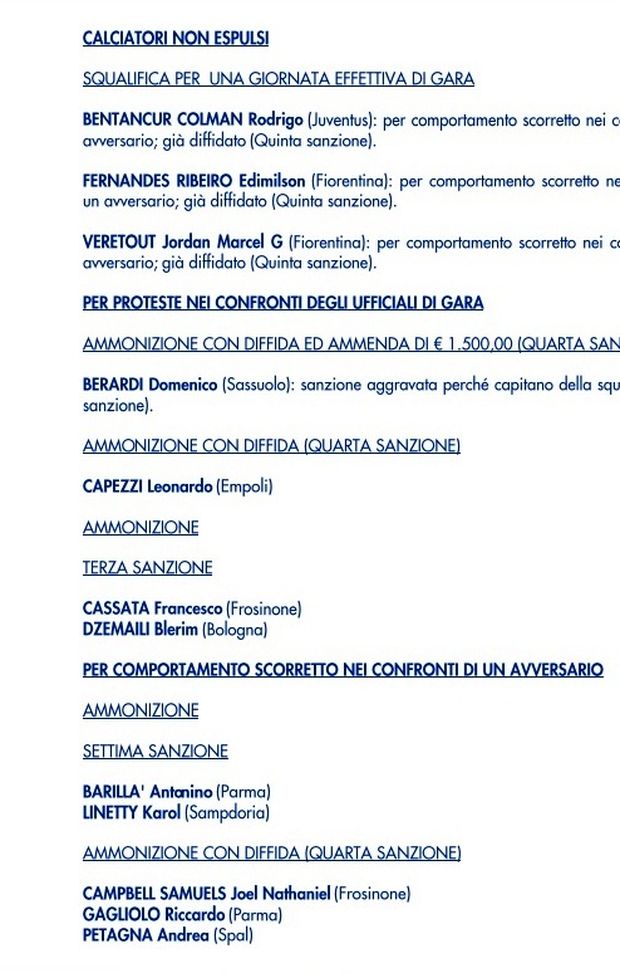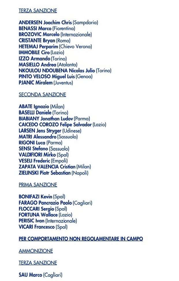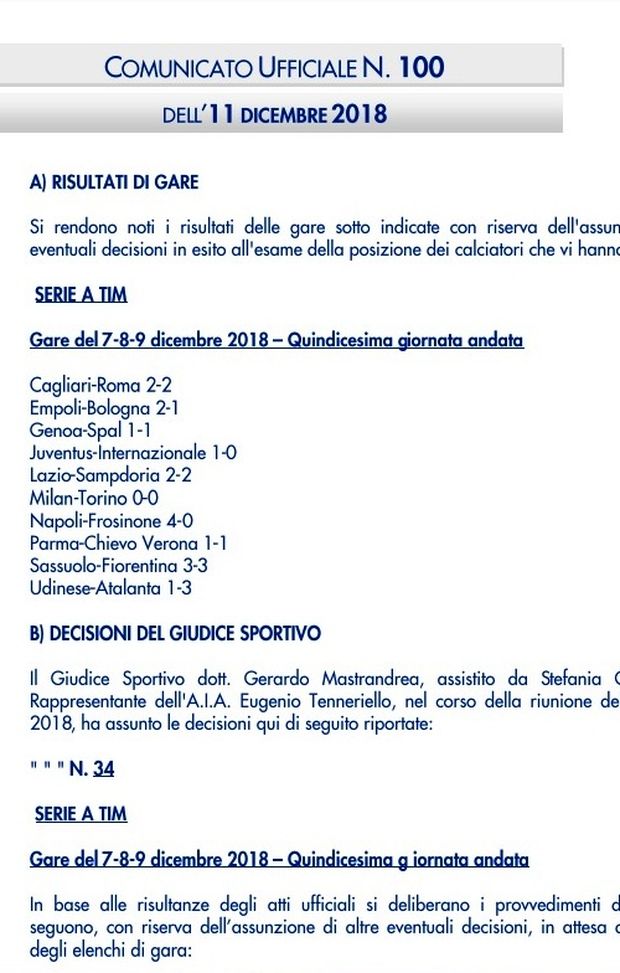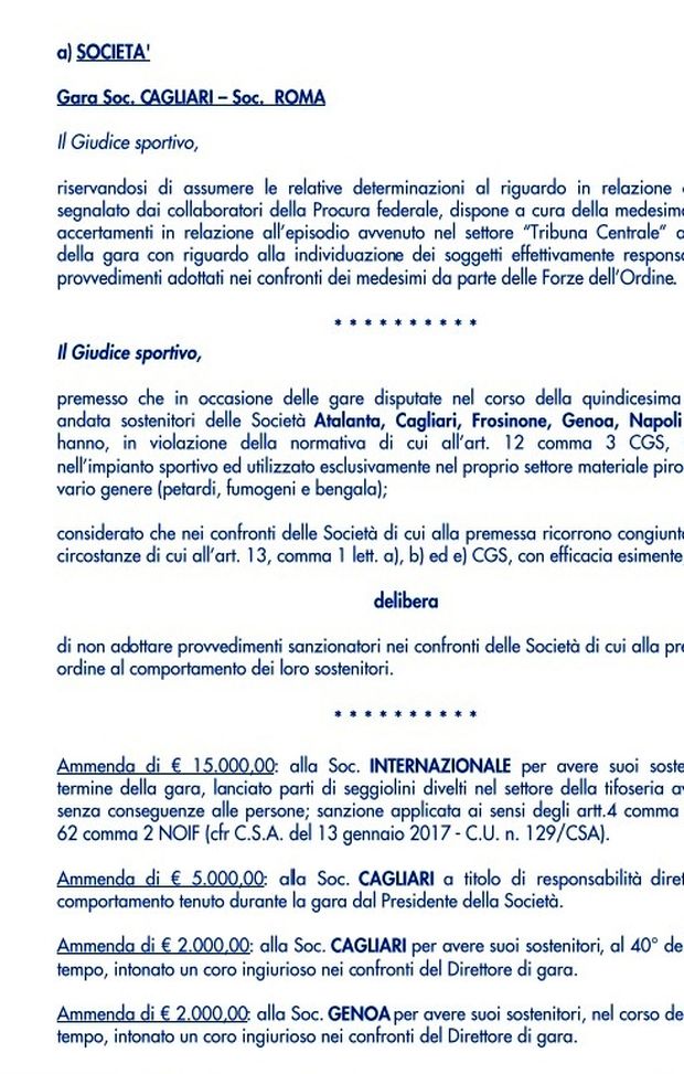 Il comunicato ufficiale del Giudice Sportivo dopo la 15° giornata di Serie A