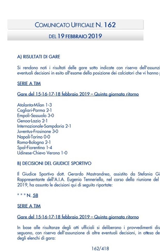 – Risultati e classifica del campionato “Primavera 1”