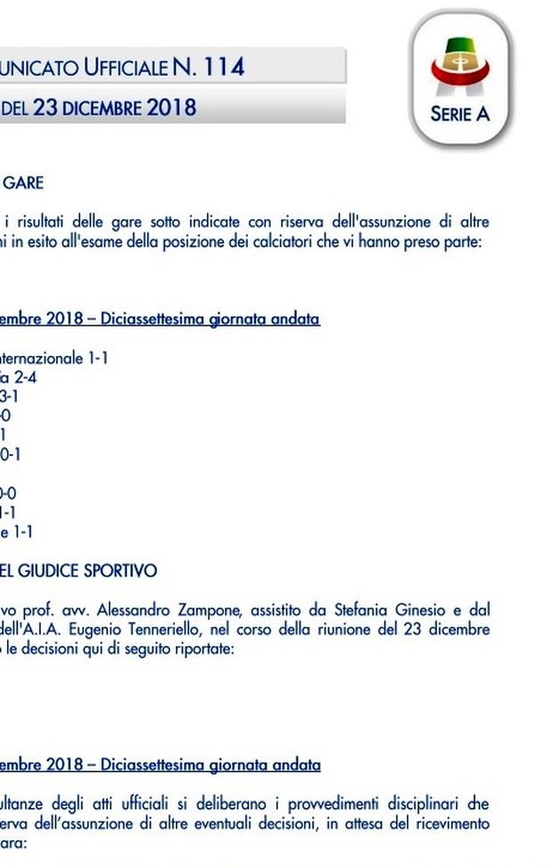 Il comunicato del Giudice Sportivo dopo la 17° giornata di Serie A