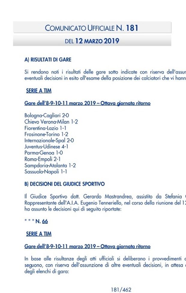 Il comunicato ufficiale completo del Giudice Sportivo dopo la 27° giornata di Serie A