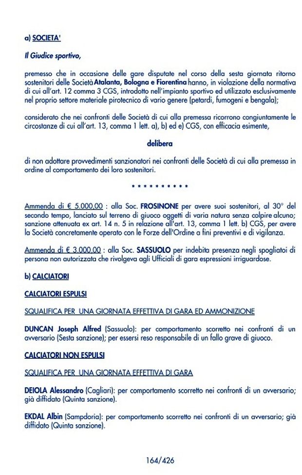 Differenze alla 25° giornata: vola il Sassuolo. Male le romane