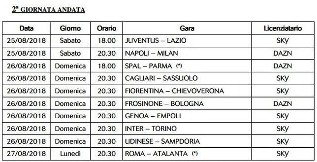 (*): In caso di mancata qualificazione della società ATALANTA al terzo turno preliminare di UEFA Europa League, giorni e orari di disputa delle gare SPAL – PARMA e ROMA – ATALANTA saranno invertiti