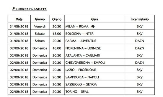 (*): In caso di mancata qualificazione della società ATALANTA al terzo turno preliminare di UEFA Europa League, giorni e orari di disputa delle gare SPAL – PARMA e ROMA – ATALANTA saranno invertiti