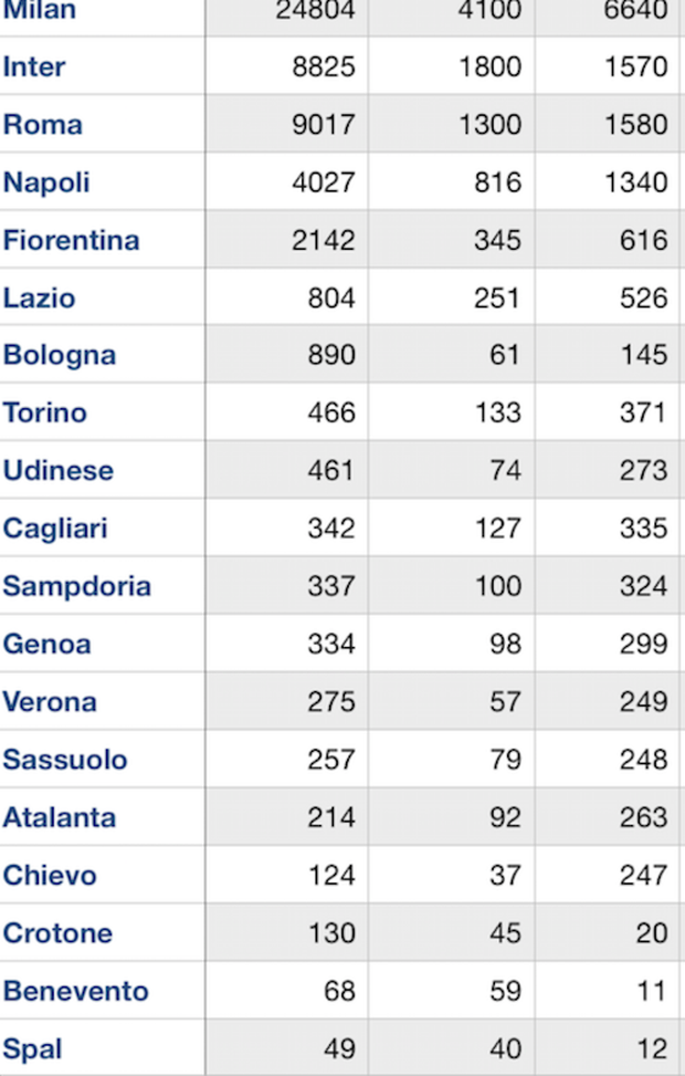 Di seguito la tabella con tutti i followers delle 20 società di Serie A espressi in migliaia. Si parte dai 39.318.000 follower juventini su Facebook per arrivare ai soli 1000 utenti che seguono il Lecce su twitter
