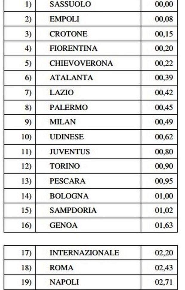 La classifica tiene conto esclusivamente dei provvedimenti disciplinari adottati per comportamento dei tifosi: